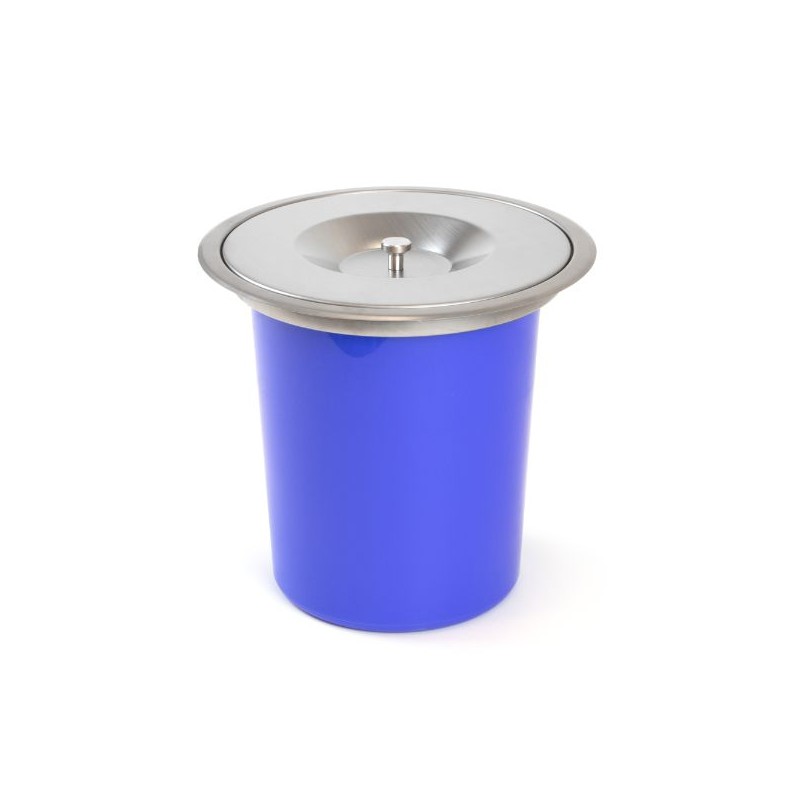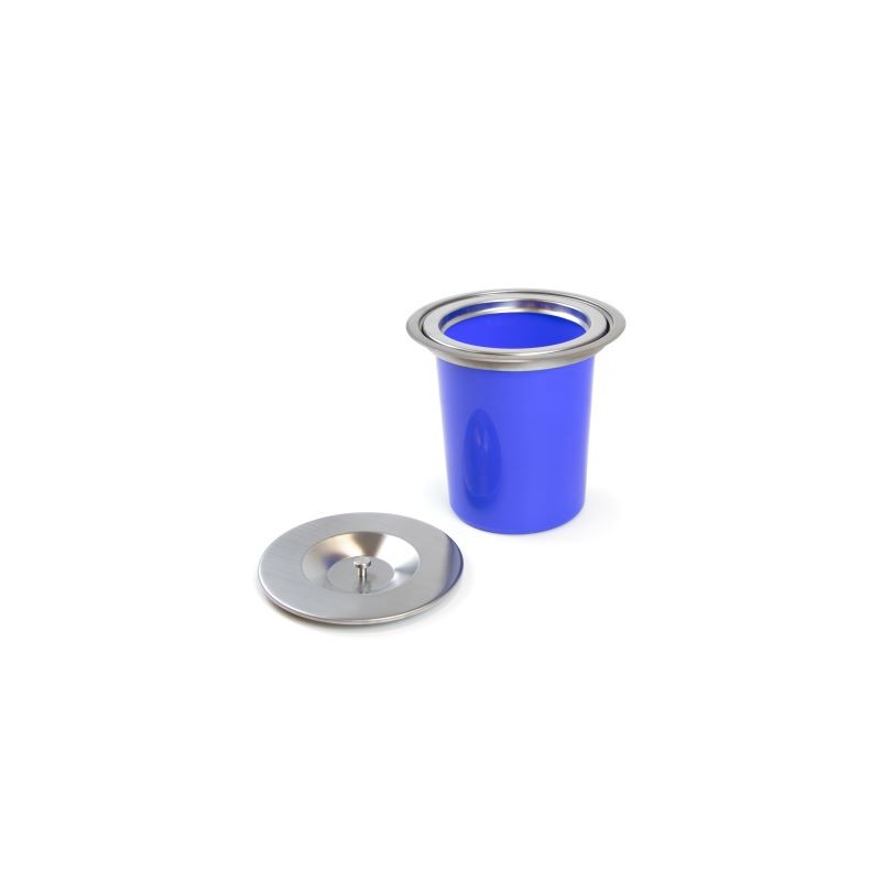 La fourniture comprend un conteneur, le couvercle, deux anneaux et des instructions de montage. En plastique bleu et en acier inoxydable.